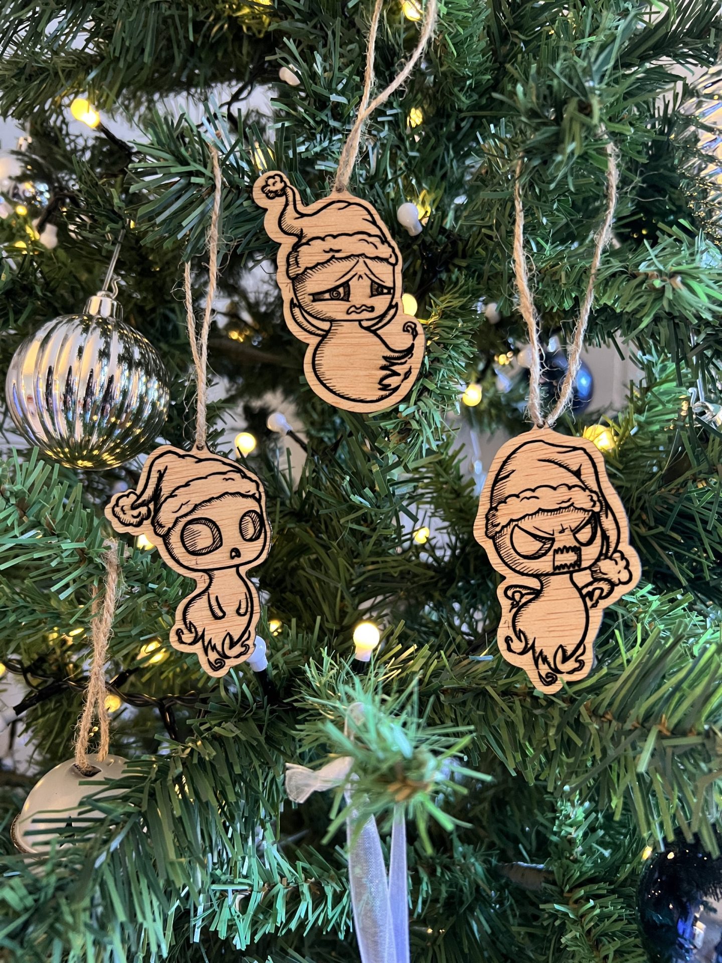 Tres adornos de «fantasmas absorbe almas» navideños para colgar.